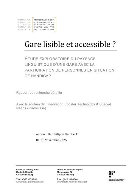 Sprache Nicht angegeben Authors Philippe Humbert Date publication Di., 09.12.2025 - 12:00 Documents Gare lisible et accessible ? (Rapport détaillé) (4.25 MB) Send to all affiliates On Intro Rapport de recherche détaillé, Institut de plurilinguisme, Fribourg, 2025 Vers la page du projet Category Forschungsberichte