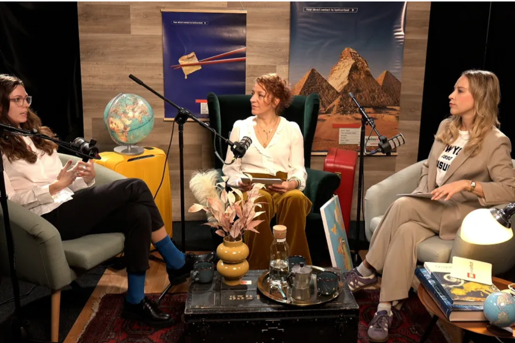 Bild: Giulia Berchio im Gespräch mit den Journalistinnen Claire Micallef (mitte) und Camille Kündig (rechts). © Swissinfo